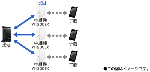 安定した電波を、さらに遠くの部屋へ飛ばしたい…。そんな時は、多段・並列による中継接続も可能です。