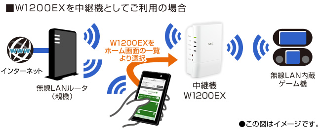 お手持ちのスマートフォン/タブレットとW1200EXをWi-Fi接続後、本アプリを起動すると自動でW1200EXを検索。あとは画面表示に従ってタップすることで、各種設定が行えます。