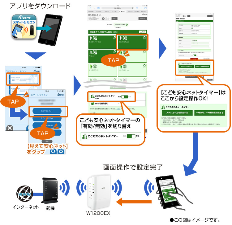 無料の専用アプリ「Aterm スマートリモコン」対応。スマホやタブレットからAterm本体の詳細設定や【見えて安心ネット】、【こども安心ネットタイマー】の設定がダイレクトで行えます。