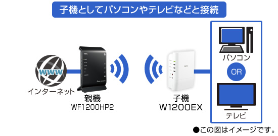 親機と子機に、WF1200HP2など【TVモード】を搭載したモデルをご使用の場合には【TVモード】での中継接続が可能。「アクトビラ」など、インターネットでのストリーミングも、11ac/11n/11a(5GHz帯)の無線LANとWi-FiのQoS規格“WMM”対応により、映像を楽しむことができます。