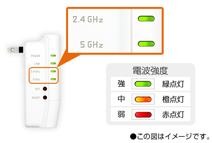 本体側面のランプ表示によって、親機との電波強度を「強(緑点灯)」、「中(橙点灯)」、「弱(赤点灯)」の3段階でお知らせ。使用している電波の強度を見ながら、中継に適した設置場所が探せます。