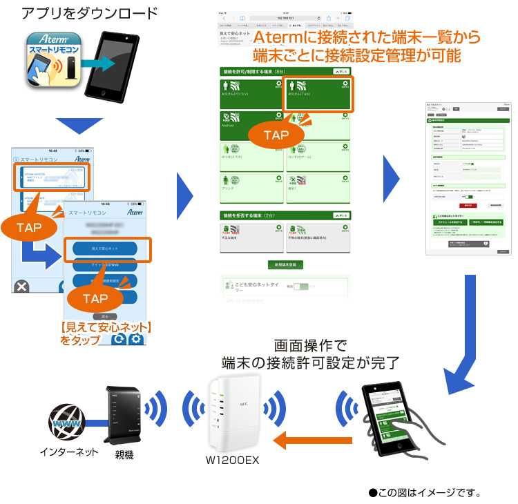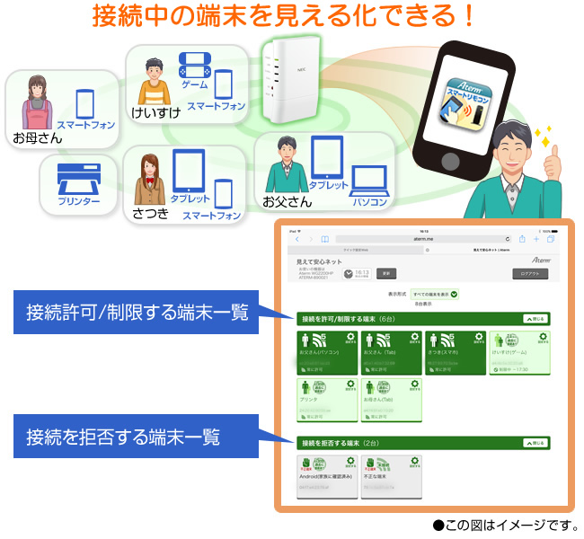 専用アプリ「Aterm スマートリモコン」を使い、Atermに接続している端末を一覧表示して、分かりやすく管理できる機能が【見えて安心ネット】です。家族共用の端末はもちろん、各自で所有する端末に対して接続の許可/拒否や接続制限など、詳細な設定が行えます。
