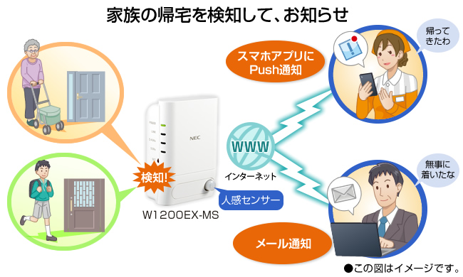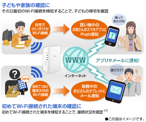 端末の検知機能を応用し、あらかじめ設定した条件に合致するWi-Fi接続を検知すると、スマホアプリやメールで知らせてくれるのが【Wi-Fi接続通知機能】です※1。たとえば「その日最初のWi-Fi接続を検知した時」、「登録していない端末からWi-Fi接続があった時」など、条件指定の設定により暮らしの中で便利に役立てることができます。
