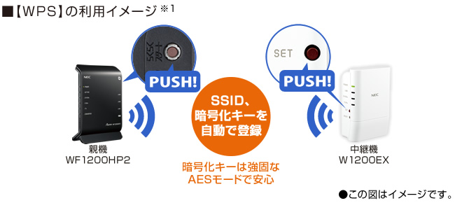 Wi-Fi Allianceが定めた無線LANの設定規格“WPS (Wi-Fi Protected Setup)”に対応しています。WPSに対応している親機となら、WPSボタン(SETボタン)を押すカンタン設定※1。親機と中継機のWi-Fi接続やセキュリティ設定が行えます。