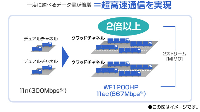 従来の11n(300Mbps)に比べ、2倍以上の超高速通信!