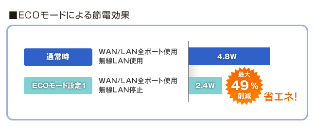 - ※ WAN/LAN全ポートを使用した通常時と、ECOモード設定時の待機消費電力の測定値を比較。無線LANを停止し、有線の通信速度を10Mbpsに制限してLEDランプ(POWERランプを除く)を消灯した場合の削減率。