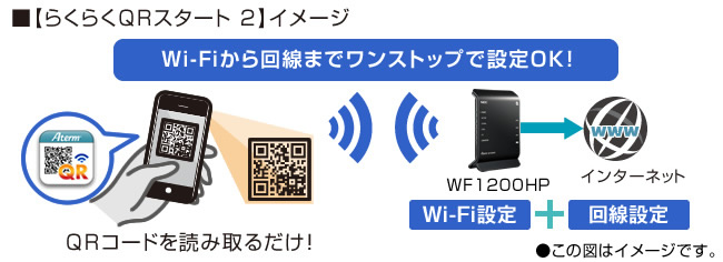 スマートフォンやタブレットに、専用の無料アプリ「らくらくQRスタート」をダウンロード。あとは本体に添付のQRコードを読み取るだけで、AtermとのWi-Fi接続設定からインターネットの回線接続設定まで、ワンストップで行えます。