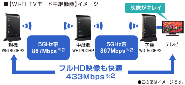 - * 本機能の中継機はWF1200HPをご使用ください。親機に有線ポートがギガ対応の「WG1800HP2」「WG1400HP」を使えば、インターネットをより高速で楽しむことができます。