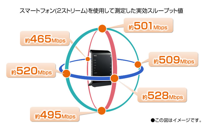 - ※1 WG1200HP3‐iPhone X(5GHz帯/VHT80にて接続)間の実効スループット値です。