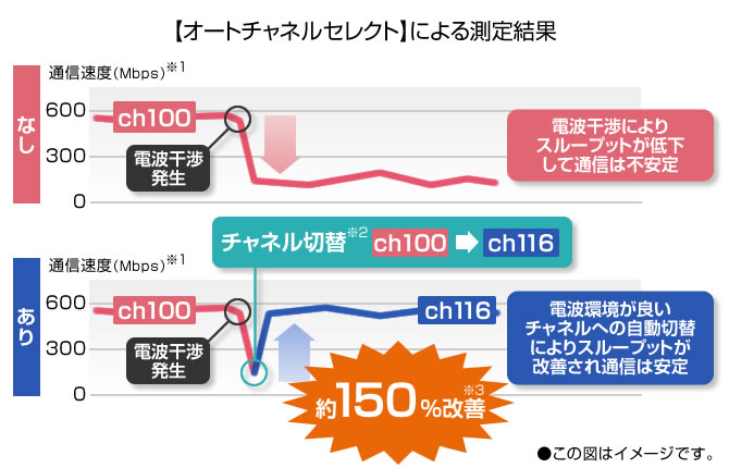 周囲にある他の無線LANアクセスポイントの利用状況をサーチし、電波状況の良いチャネルへ自動的に切り替える機能が【オートチャネルセレクト】です。