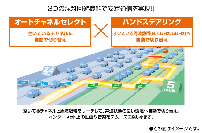 動作中も5GHz帯と2.4GHz帯ともに、電波干渉が少なく混雑していないチャネルを使用するため、無線LANの高速性をより有効に活かすことができます。