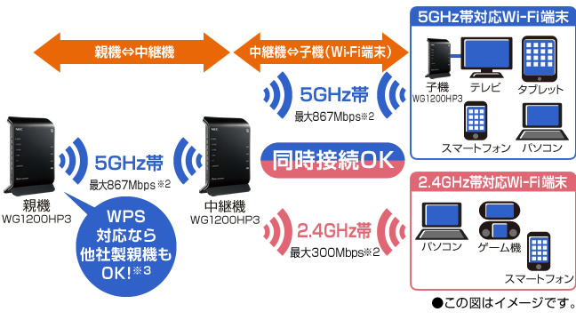 また、WG1200HP3は、WPS対応の他社製親機※3にも中継機として接続できます。