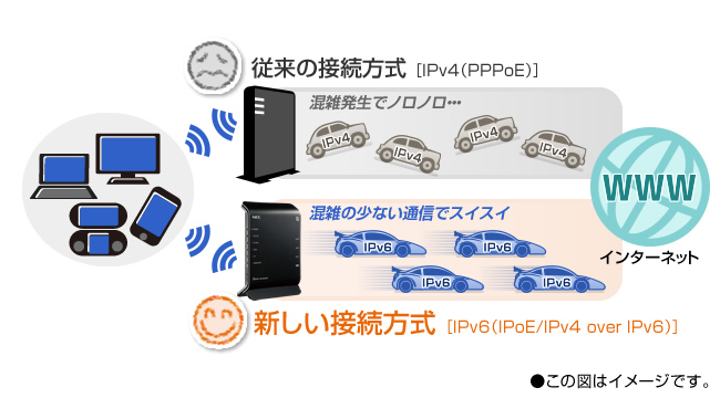 ネット接続端末の爆発的な増加により、新たに登場した接続方式「IPv6(IPoE)※」に対応しました。従来のIPv4方式に比べて混雑がなく、快適な通信が可能になります。