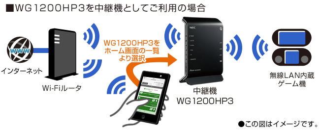 - スマホ等のWi-Fi端末が、WG1200HP3(中継機)に接続されていること。