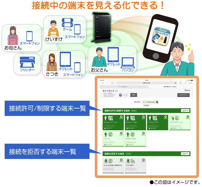 専用アプリ「Aterm スマートリモコン」を使い、Atermに接続している端末を一覧表示して、分かりやすく管理できる機能が【見えて安心ネット】です。家族共用の端末はもちろん、各自で所有する端末に対して接続の許可/拒否や接続制限など、詳細な設定が行えます。アプリを使用できるので、スマホやタブレットからの操作も簡単です。