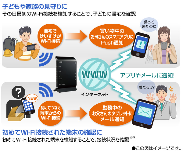 端末の検知機能を応用し、あらかじめ設定した条件に合致するWi-Fi接続を検知すると、スマホアプリやメールで知らせてくれるのが【Wi-Fi接続通知機能】です※1。たとえば「その日最初のWi-Fi接続を検知した時」、「登録していない端末からWi-Fi接続があった時」など、条件の設定により暮らしの中で便利に役立てることができます。