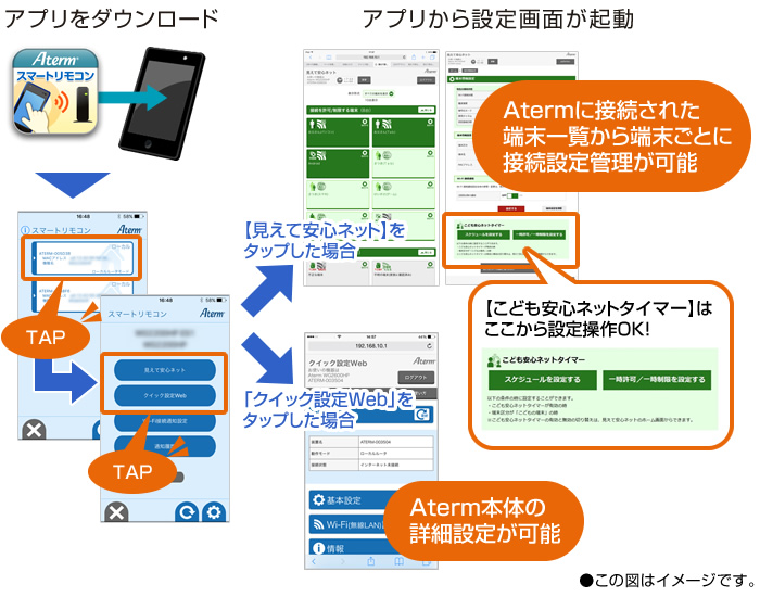 - * 【こども安心ネットタイマー】は、スマートフォン/タブレット用アプリ「Aterm スマートリモコン」を使用します。詳細はこちらでご確認ください。