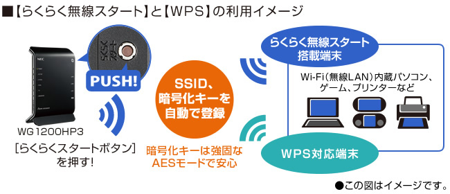 また、Wi-Fi Allianceが定めた無線LANの設定規格“WPS (Wi-Fi Protected Setup)”に対応した端末とも、ボタンを押すだけで簡単に設定できます。