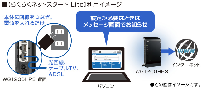 インターネット接続は本体に回線をつないで 電源を入れるだけでOK。