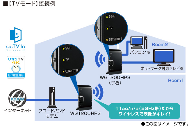 - ※「アクトビラ」のWG1200HP3による有線/無線LANでのご利用は弊社で動作確認済みです。