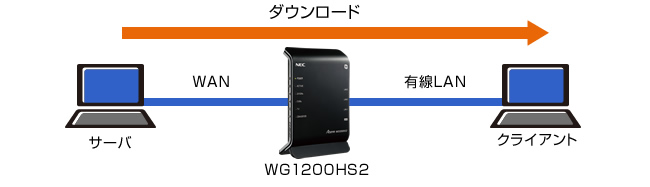 Aterm WG1200HS2のWANポートに接続したサーバからLANポートに接続したクライアントパソコンでファイルをダウンロードした場合のデータ転送速度の実測値です。