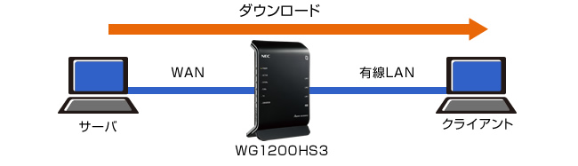 Aterm WG1200HS3のWANポートに接続したサーバからLANポートに接続したクライアントパソコンでファイルをダウンロードした場合のデータ転送速度の実測値です。