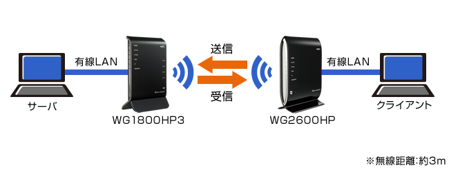 Aterm WG1800HP3[ローカルルータモード]のLANポートに接続したサーバパソコンからWG2600HP[子機モード]を接続したクライアントパソコンへのデータ転送速度(受信)の実測値です。なお、クライアントパソコンからサーバパソコンへの通信速度(送信)は、受信速度より低い場合があります。