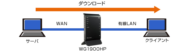 Aterm WG1900HPのWANポートに接続したサーバからLANポートに接続したクライアントパソコンでファイルをダウンロードした場合のデータ転送速度の実測値です。