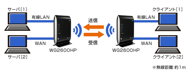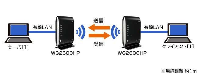 Aterm WG2600HP[ブリッジモード]のLANポートに接続したサーバパソコンからWG2600HP[子機モード]を接続したクライアントパソコンへのデータ転送速度(受信)の実測値です。なお、クライアントパソコンからサーバパソコンへの通信速度(送信)は、受信速度より低い場合があります。