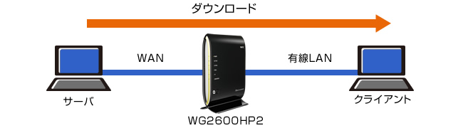 Aterm WG2600HP2のWANポートに接続したサーバからLANポートに接続したクライアントパソコンでファイルをダウンロードした場合のデータ転送速度の実測値です。