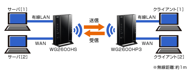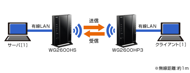 Aterm WG2600HS[ブリッジモード]のLANポートに接続したサーバパソコンからWG2600HP3[子機モード]を接続したクライアントパソコンへのデータ転送速度(送信)の実測値です。なお、クライアントパソコンからサーバパソコンへの通信速度(受信)は、送信速度より低い場合があります。
