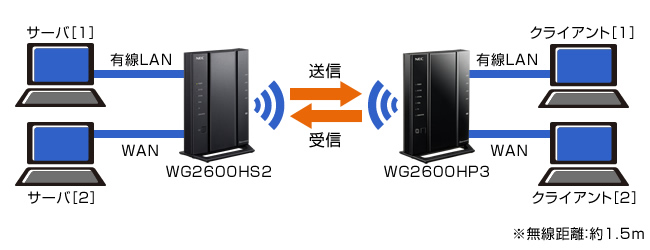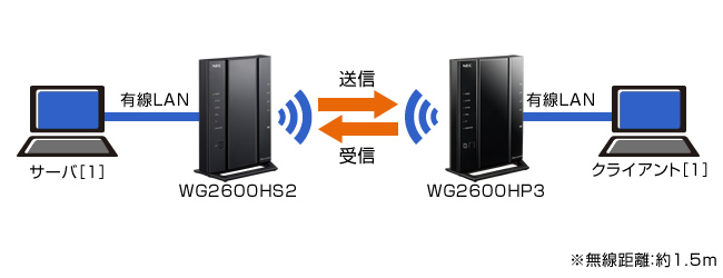 Aterm WG2600HS2[ブリッジモード]のLANポートに接続したサーバパソコンからWG2600HP3[子機モード]を接続したクライアントパソコンへのデータ転送速度(送信)の実測値です。なお、クライアントパソコンからサーバパソコンへの通信速度(受信)は、送信速度より低い場合があります。