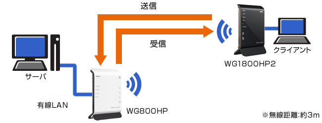 Aterm WG800HP[ローカルルータモード]のLANポートに接続したサーバパソコンからWG1800HP2を接続したクライアントパソコンへのデータ転 送速度(受信)の実測値です。なお、クライアントパソコンからサーバパソコンへの通信速度(送信)は、受信速度より低い場合があります。