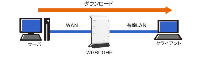 Aterm WG800HPのWANポートに接続したサーバからLANポートに接続したクライアントパソコンでファイルをダウンロードした場合のデータ転送速度の実測値です。