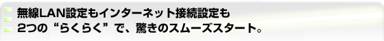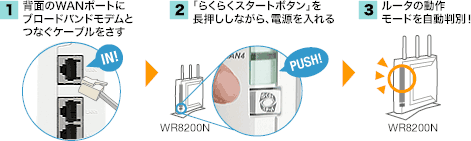 ブロードバンドルータのインターネット接続設定時、戸惑うことの多い動作モード選択。新機能[らくらくネットスタート]なら、「らくらくスタートボタン」を長押ししながら、電源を入れるだけで、「PPPoEルータモード」「ローカルルータモード」「アクセスポイントモード」の中から適切な動作モードを自動判別してインターネットに接続します。接続アカウント設定が必要な「PPPoEルータモード」の場合も、専用画面からIDとパスワードを入力するだけで大丈夫。これならもう悩む必要はありません。