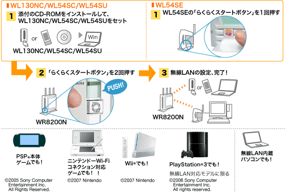 「WL130NC」をはじめ、“11g/11b”対応のAtermシリーズ子機はもちろん、Windows(R) XP SP2搭載の無線LAN内蔵パソコン、PSP「プレイステーション・ポータブル」本体のブラウザ機能やPSP専用ゲーム、ニンテンドーWi-Fiコネクション“対応ゲームやニンテンドーDSブラウザー“も、らくらく無線スタートによる接続設定に対応しています。