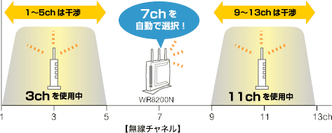 多くの機器が利用する2.4GHz帯。AtermWR8200Nは、電源起動時に周囲のアクセスポイントの利用状況をチェックして、1〜13chの中から他の無線LAN機器の影響を受けにくいチャネルを自動的にセレクトします。"11n"も電波が混雑した環境では効果が半減。せっかくの速さを活かすには、チャネルセレクトも重要なのです。