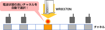 起動時に、周囲にある他の無線LAN機器のアクセスポイントをサーチして、最も電波状態の良い、空いているチャネルを自動的に選択。電波干渉を受けにくいチャネルで、快適な通信が楽しめます。