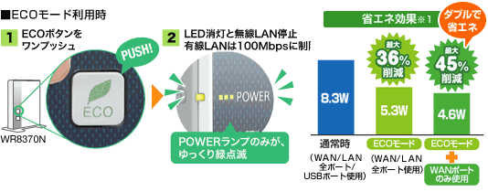 - ※1 WAN/LAN全ポートとUSBポートを使用した通常時と、ECOモード設定時の待機消費電 力の測定値を比較。USBポートに接続した機器の消費電流は100mA(5V)。