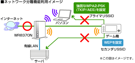 WR8370Nなら、セカンダリSSIDに接続した機器は、インターネットへのアクセスだけできるようにし、プライマリSSIDや有線LANに接続の機器へのアクセスを制限できます。例えばWEP暗号化を設定したゲーム機から、強固なAES暗号化を設定したパソコンにアクセスできないので安心です。さらにセカンダリSSIDには「AES」も設定できるので、一家で仕事用と家庭用のパソコンなど無線機器を分離させたネットワークも利用できます。