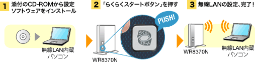 無線LANの接続設定も、セキュリティ設定もボタンを押すだけ![らくらく無線スタート]