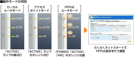 ブロードバンドルータのインターネット接続設定時に必要な動作モード選択も、Atermの[らくらくネットスタート]なら「らくらくスタートボタン」を長押ししながら電源を入れるだけ。「PPPoEルータモード」「ローカルルータモード」「アクセスポイントモード」の中から適切なモードを自動判別して、インターネットに接続します。