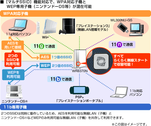![[マルチSSID]機能対応で、WPA対応子機とWEP専用子機(ニンテンドーDS等)が混在可能](/product/atermstation/product/warpstar/wr8370n-st/images/feature_img_ssid.gif)