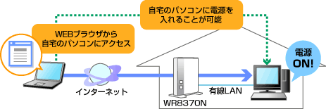 外出先など離れている場所から、インターネット経由で自宅のパソコンの電源を入れることが可能。必要な時にパソコンをリモート操作で起動できるので、自宅のパソコンをつねに起ち上げておく必要がなくなります※1。