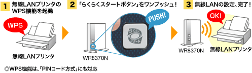 Wi-Fiが定めた無線LANの設定規格"WPS (Wi-Fi Protected Setup)"に対応したパソコンやプリンタなどとも、ボタンを押すだけの簡単設定です。