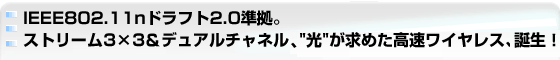 無線LAN高速化技術を盛り込んだ、IEEE委員会で検討中のIEEE802.11n。Atermはこの先端規格により、まず複数の無線部により2つのデータストリームを1つのチャネル上で空間多重する「MIMO」で伝送速度を倍速化。さらに、理論値で300Mbps(※1)、実効スループットでも有線接続にせまるハイスピードを実現(デュアルチャネルモード)。まさに、光ブロードバンド時代にふさわしい高速ワイヤレス通信のためのスペックです。