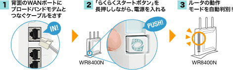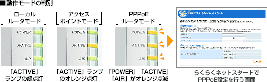 ブロードバンドルータのインターネット接続設定時の動作モード選択も、Atermの[らくらくネットスタート]なら、「らくらくスタートボタン」を長押ししながら電源を入れるだけ。「PPPoEルータモード」「ローカルルータモード」「アクセスポイントモード」の中から適切なモードを自動判別して、インターネットに接続します。