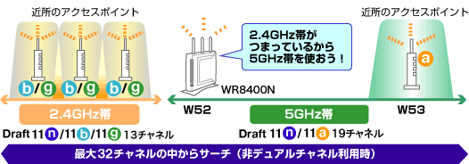 起動時に、周囲にある他の無線LAN機器のアクセスポイントの利用状況をチェック。"5GHz帯"と"2.4GHz帯"のチャネル(※1)をサーチして、電波状態の良いチャネルをAtermが自動でセレクトします(※2)。電波干渉の影響が少なく混雑していないチャネルを使用するため、Draft 11nの高速性をより有効に活かすことができます。
