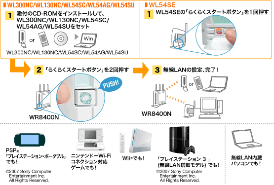 Aterm子機シリーズをはじめ、無線LAN内蔵パソコン、PLAYSTATION(R)3 のブラウザ機能や、PSP(R)「プレイステーション・ポータブル」本体、PSP(R)専用ゲーム、ニンテンドーWii(R)やニンテンドーWi-Fiコネクション(TM)対応ゲームも「らくらく無線スタート」による接続設定に対応しています。