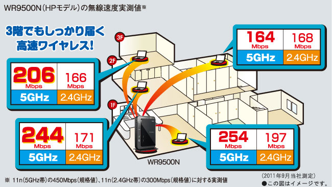 従来の11n300Mbpsの1.5倍高速化、450Mbps(規格値)を実現!2ストリームから3ストリームへと進化し、より高速で安定した通信が行えます。(11na・5GHzの場合。11nbg・2.4GHzは300Mbps対応)高性能アンテナと、無線回路などの送受信機能を独自の技術で最適化した、ハイパーロングレンジ対応で、高速通信がワイドによく届きます。